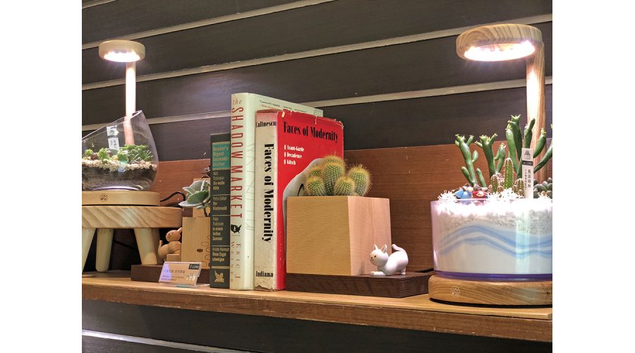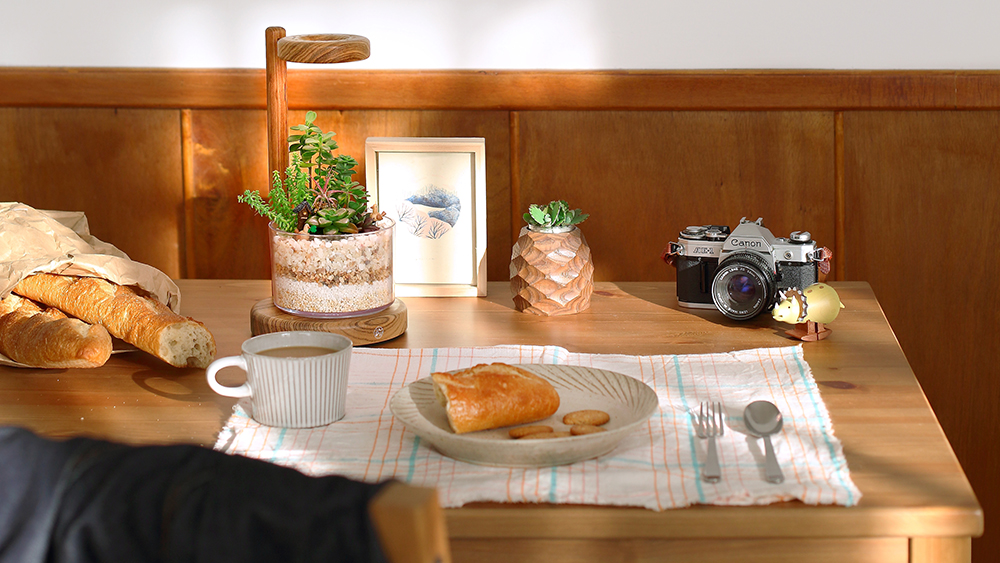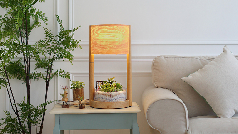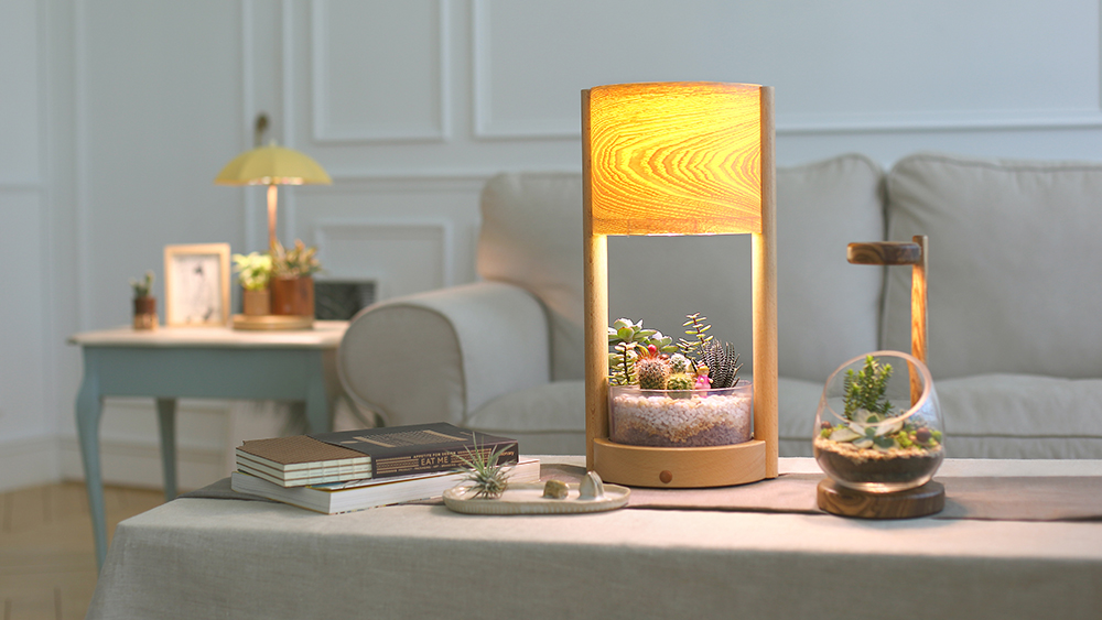光共生以原木打造植物燈座,LED燈特殊模擬太陽光設計,搭配定時光照設定,讓植物在室內也能適當地行光合作用,日日都有暖陽般照耀,輕鬆實現屋裡的園藝生活。
