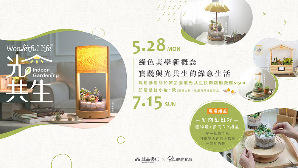 Wooderful life光共生快閃門市,即日起至7/15(日)於勤美誠品綠園道店登場,現場展售多款原木設計植物燈,並規劃DIY組盆體驗,動手打造專屬綠園地,期間更推出滿額贈等好康優惠活動,實現與光共生的綠意生活就從現在開始!
